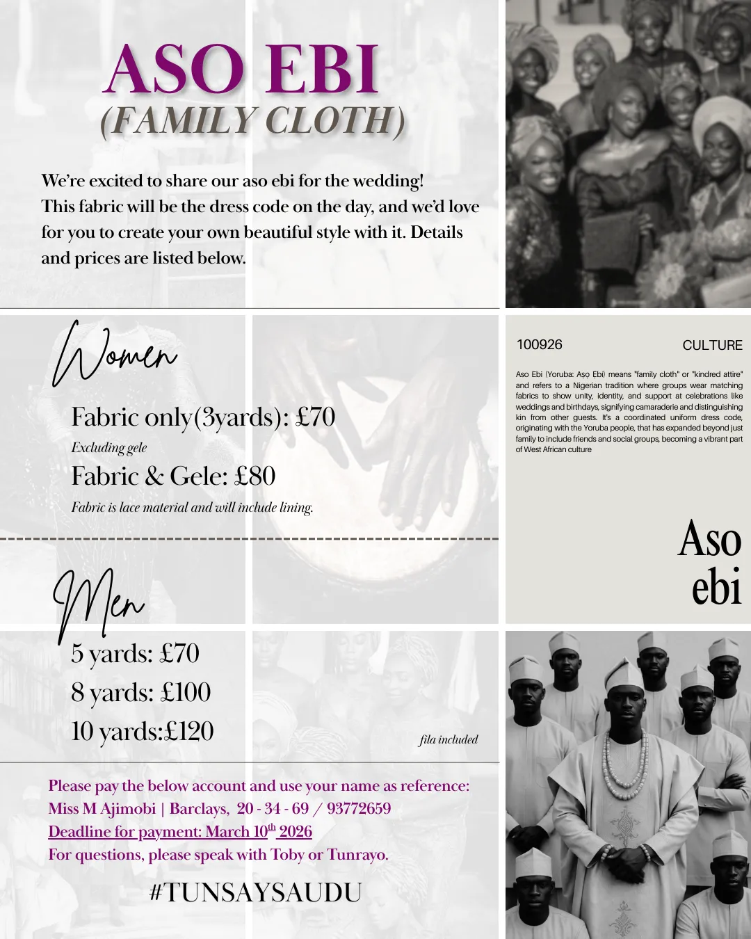 Kindly note that the deadline for all payments is March 10th, 2026. If you are interested in purchasing aso ebi but may need a little more time, please don’t hesitate to reach out to us.